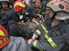 L'intervention rapide de l'État a été remarquée par rapport à l'inertie de la Birmanie lors d'une récente catastrophe, et l'inaction du gouvernement américain après l'ouragan Katrina[54]. Le président Hu Jintao a annoncé des mesures rapides à la taille de la catastrophe. 90 minutes après le tremblement de terre, le premier ministre Wen Jiabao, ayant une formation universitaire de géomécanique, s'est rendu dans la zone touchée pour mener les opérations de secours. La Commission d'État pour la lutte contre les catastrophes de Chine a annoncé un « plan d'urgence de niveau II » qui couvre les types de catastrophes naturelles les plus graves le à 22 h 15 CST. Le , le ministre chinois de la santé déclare qu'il a envoyé 10 équipes de secours médical dans le district de Wenchuan. Le même jour, le commandement chinois de la zone militaire de Chengdu a envoyé 50 000 soldats et policiers armés pour soutenir le travail d'assistance dans le district de Wenchuan. Une équipe d'aide d'urgence composée de 184 personnes (dont 12 personnes du Bureau sismique d'État, 150 personnes du commandement de la zone militaire de Pékin, et 22 personnes de l'hôpital général de la police armée) ont quitté Pékin par l'Aéroport de Nanyuan le en fin de journée dans des avions de transport militaire pour se rendre dans le district de Wenchuan. Le mercredi 14, de nombreuses équipes de secours, y compris à Taipei se sont déclarées prêtes à rejoindre les opérations de sauvetage dans le Sichuan. La Croix-Rouge chinoise a résumé la situation : « Actuellement l'accès aux zones sinistrées, notamment proche de l'épicentre est particulièrement difficile. Les besoins en tentes, médicaments eau et nourrisseurs sont immenses, mais les dons en espèce sont préférables, étant donné les difficultés d'accès, les routes étant bloquées par des glissements de terrain. »