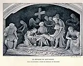 Joseph d'Arimathie, un genou à terre, l'autre soutenant le Christ.