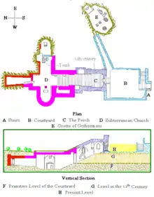 L'église est précédée, au sud, d'un parvis entouré de murs. Creusée dans la roche, elle est de plan cruciforme. On y accède par un escalier construit par les croisés au XIIe siècle. Tout de suite à droite se trouve l'autel de saint Étienne. En descendant à gauche, du côté occidental, se trouve la chapelle Saint-Joseph (abritant selon la tradition l'époux de Marie dans une niche prévue d'abord pour le tombeau de Baudoin II), appartenant aux Arméniens depuis 1814. Une niche à droite, côté oriental, correspond à la chapelle Sainte-Anne-et-Saint-Joachim[17], qui serait selon la tradition la tombe des parents de Marie, Anne et Joachim, initialement construite pour contenir le tombeau de la reine Mélisende, fille de Baudoin II et mère de Baudoin III, roi de Jérusalem, qui fit restaurer l'église en 1167. Son sarcophage a été enlevé de là par les orthodoxes grecs. L'entrée se trouve à la vingt-troisième marche[18].