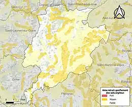 Le retrait-gonflement des sols argileux est susceptible d'engendrer des dommages importants aux bâtiments en cas d’alternance de périodes de sécheresse et de pluie[18]. 31,2 % de la superficie communale est en aléa moyen ou fort (27 % au niveau départemental et 48,5 % au niveau national métropolitain)[Carte 2]. Depuis le , en application de la loi ÉLAN, différentes contraintes s'imposent aux vendeurs, maîtres d'ouvrages ou constructeurs de biens situés dans une zone classée en aléa moyen ou fort[Note 3],[19].