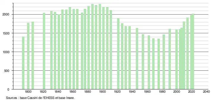 L'évolution du nombre d'habitants est connue à travers les recensements de la population effectués dans la commune depuis 1793. Pour les communes de moins de 10 000 habitants, une enquête de recensement portant sur toute la population est réalisée tous les cinq ans, les populations légales des années intermédiaires étant quant à elles estimées par interpolation ou extrapolation[24]. Pour la commune, le premier recensement exhaustif entrant dans le cadre du nouveau dispositif a été réalisé en 2004[25].
