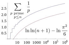 - où est la constante de Meissel-Mertens[alpha 1] et la constante d'Euler.