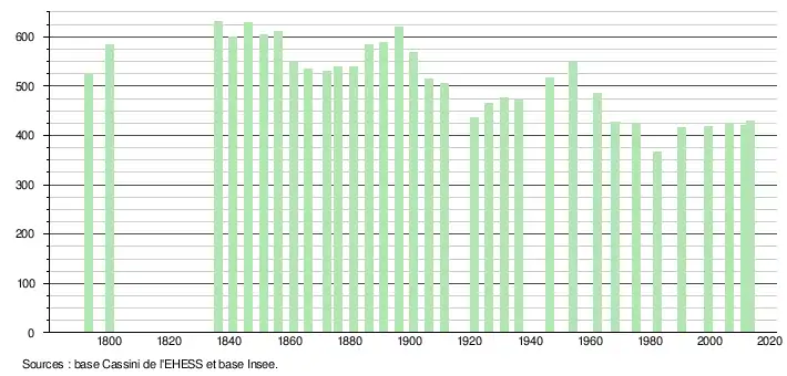 L'évolution du nombre d'habitants est connue à travers les recensements de la population effectués dans la commune depuis 1793. À partir du , les populations légales des communes sont publiées annuellement dans le cadre d'un recensement qui repose désormais sur une collecte d'information annuelle, concernant successivement tous les territoires communaux au cours d'une période de cinq ans. Pour les communes de moins de 10 000 habitants, une enquête de recensement portant sur toute la population est réalisée tous les cinq ans, les populations légales des années intermédiaires étant quant à elles estimées par interpolation ou extrapolation[2]. Pour la commune, le premier recensement exhaustif entrant dans le cadre du nouveau dispositif a été réalisé en 2006[3],[Note 1].