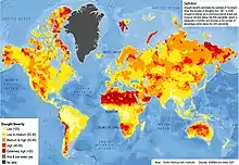 Les sécheresses sont fréquentes et graves dans beaucoup de pays d'Afrique subsaharienne et ont un impact dévastateur sur les populations et leurs économies[7]. L’extrême vulnérabilité aux précipitations dans les zones arides et semi-arides du continent et, la faible capacité d’une grande partie des sols africains à maintenir l'humidité font que presque 60 % des sols sont vulnérables à la sécheresse et 30 % extrêmement vulnérables. Depuis les années 1960, les précipitations du Sahel et de l'Afrique australe ont également été sensiblement en dessous des normes des 30 années précédentes. De plus, la perspective d'un effet El Niño a conduit à porter plus d'attention sur l'impact de la sécheresse en Afrique subsaharienne[réf. nécessaire]. Le désert progresse au Mali[8], au Tchad[9] et au Niger en particulier, à raison de plusieurs kilomètres par an[10].
