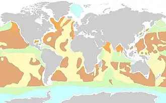 Carte de répartition des sédiments marins dans l'Océan mondial. Jaune : sédiments carbonatés biogènes[1] ; brun : argiles rouges des grands fonds ; orange : sédiments terrigènes[2] ; blanc : sédiments des marges continentales ; vert : sédiments siliceux biogènes[3] ; bleu : sédiments glaciaires[4].