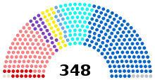 Le Sénat, qui compte 348 sénateurs depuis le renouvellement de 2011, a subi plusieurs réformes de son mode d'élection. Depuis l'adoption de la loi no 2003-697 du , le mandat des sénateurs est de six ans, et le renouvellement s'effectue par moitié, tous les trois ans depuis 2011. Les sénateurs sont élus au suffrage universel indirect, par 150 000 grands électeurs. Le scrutin est soit proportionnel (73,5 %), soit uninominal à deux tours (26,5 %) au niveau départemental[1].