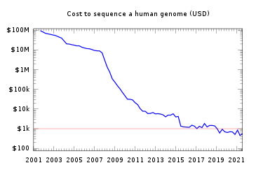 Le premier séquençage complet d’un génome humain s’est achevé en 2003 et a nécessité une dizaine d'années de travail, avec un investissement total de 2,7 milliards de dollars[24]. À l’époque, la méthode de Sanger était encore massivement employée pour décrypter les quelque 3 milliards de paires de nucléotides qui composent notre ADN. De nombreux projets sont ensuite apparus, (notamment 1000 Génomes, ENCODE…) et de nouvelles machines (citées au-dessus) ont été développées avec pour objectif de générer la séquence complète d’un génome humain pour moins de 1000 dollars[25]. Avec l’amélioration des méthodes de séquençage, le prix du séquençage partiel d’un génome humain en haute qualité était estimé à 14 millions de dollars en 2006[26], relativement moins coûteux par rapport au projet achevé en 2003. Fin 2015, le prix pour générer une même séquence était de 1500 dollars environ.