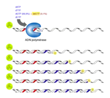 Par exemple, dans la réaction où on a ajouté du ddGTP, la synthèse s'arrête au niveau des G. Le mélange réactionnel contenant, à la fois du dGTP et un peu de ddGTP, la terminaison se fait de manière statistique suivant que l'ADN polymérase utilise l'un ou l'autre de ces nucléotides. Il en résulte un mélange de fragments d’ADN de tailles croissantes, qui se terminent tous au niveau d'un des G dans la séquence. Ces fragments sont ensuite séparés par électrophorèse sur un gel de polyacrylamide[6], ce qui permet ainsi de repérer la position des G dans la séquence.