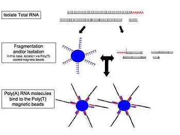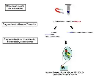 La création d'une librairie de séquençage peut varier de plateforme à plateforme de séquençage à haut débit[9], pour chacune desquelles il existe de nombreux kits dédiés à la création de différents types de librairies et pour l'adaptation des séquences résultantes aux exigences specifiques de leurs instruments. Cependant, dû à la nature des produits analysés, il existe des similarités entre chaque technologie, le principe général demeurant essentiellement le même. Fréquemment, lors d'analyses d'ARNm, la queue polyadénylée 3' (poly(A)) est ciblée de manière à assurer la séparation entre les ARN codants des ARN non-codants. Ceci est accompli par l'ajout covalent d'oligonucléoitides poly(T) au substrat. Actuellement, de nombreuses études utilisent des billes magnétiques à cet effet[10],[11],[12].