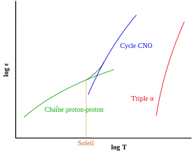 C'est à une température de 18 millions de kelvins que le cycle CNO dépasse en productivité la chaîne pp. Ceci correspond à une étoile d'environ 1,5 M☉. Ainsi, les étoiles F ou moins chaudes utilisent la chaîne pp, tandis que les A ou plus chaudes utilisent le cycle CNO[16]. La transition d'un mode de production à l'autre s'effectue sur un intervalle de moins de 1 M☉ : dans le Soleil, seulement 1,5 % de l'énergie est produite par le cycle CNO[26]. Inversement, les étoiles de plus de 1,8 M☉ tirent presque toute leur énergie du cycle CNO[27]. Au-dessus de cette masse, la température centrale devient suffisante pour permettre la fusion de protons avec des noyaux de carbone (C), azote (N) et oxygène (O), et une chaîne utilisant ces noyaux comme intermédiaires, restitués après la production d'un noyau d'hélium se met en route. C'est le cycle CNO, qui dépasse rapidement en importance la chaîne proton-proton. La supérieure est celle où domine le cycle CNO, où les protons fusionnent avec des noyaux plus lourds, carbone, azote et oxygène, qui subissent la désintégration β et finalement éjectent un α pour recommencer le cycle.