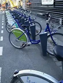 Les points d'attache des vélos reprennent le design général de l'installation. Elles incluent un mécanisme de verrouillage du vélo et un lecteur de carte qui lit les cartes d'abonnement.