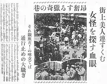 La « panique Abe Sada » dans un article du . Les journaux de l'époque ont fait état de foules rassemblées dans les rues après l'annonce de l'incident Sada Abe, insistant sur la nature absurde de l'incident.