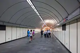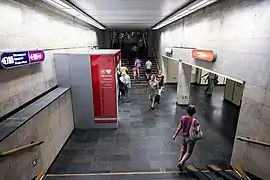 Elle dispose, en surface, de quatre bouches donnant, par des escaliers fixes, à un passage souterrain piétonnier, passant sous les voies routières et aboutissant à un hall d'accueil souterrain. Ce dernier est en relation avec le quai, par un tunnel en pente équipé de trois escaliers mécaniques, poursuivi par un couloir donnant, par deux marches, sur un palier permettant de rejoindre le nord du quai par un autre escalier fixe[2].