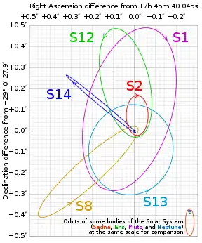 La radiosource Sgr A* est depuis 2002 considérée comme associée à un trou noir supermassif d'environ 4,297 millions de masses solaires situé au centre de notre galaxie[1],[2]. Ce trou noir est l'objet primaire d'un amas stellaire. La douzaine d'étoiles connues composant cet amas est en orbite autour du trou noir.