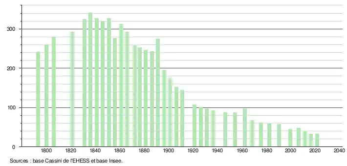 L'évolution du nombre d'habitants est connue à travers les recensements de la population effectués dans la commune depuis 1793. Pour les communes de moins de 10 000 habitants, une enquête de recensement portant sur toute la population est réalisée tous les cinq ans, les populations légales des années intermédiaires étant quant à elles estimées par interpolation ou extrapolation[15]. Pour la commune, le premier recensement exhaustif entrant dans le cadre du nouveau dispositif a été réalisé en 2006[16].