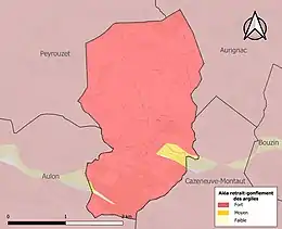 Le retrait-gonflement des sols argileux est susceptible d'engendrer des dommages importants aux bâtiments en cas d’alternance de périodes de sécheresse et de pluie. 99,6 % de la superficie communale est en aléa moyen ou fort (88,8 % au niveau départemental et 48,5 % au niveau national). Sur les 30 bâtiments dénombrés sur la commune en 2019, 30 sont en aléa moyen ou fort, soit 100 %, à comparer aux 98 % au niveau départemental et 54 % au niveau national. Une cartographie de l'exposition du territoire national au retrait gonflement des sols argileux est disponible sur le site du BRGM[25],[Carte 3].