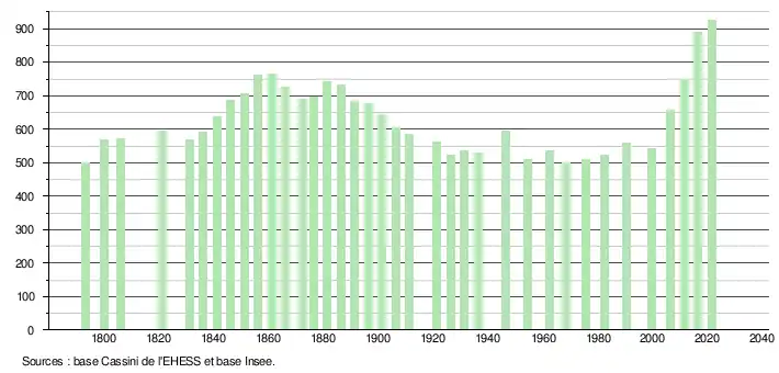 L'évolution du nombre d'habitants est connue à travers les recensements de la population effectués dans la commune depuis 1793. Pour les communes de moins de 10 000 habitants, une enquête de recensement portant sur toute la population est réalisée tous les cinq ans, les populations légales des années intermédiaires étant quant à elles estimées par interpolation ou extrapolation[27]. Pour la commune, le premier recensement exhaustif entrant dans le cadre du nouveau dispositif a été réalisé en 2006[28].
