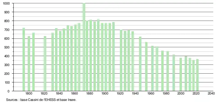 L'évolution du nombre d'habitants est connue à travers les recensements de la population effectués dans la commune depuis 1793. Pour les communes de moins de 10 000 habitants, une enquête de recensement portant sur toute la population est réalisée tous les cinq ans, les populations légales des années intermédiaires étant quant à elles estimées par interpolation ou extrapolation[22]. Pour la commune, le premier recensement exhaustif entrant dans le cadre du nouveau dispositif a été réalisé en 2006[23].