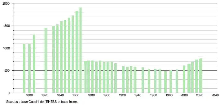 L'évolution du nombre d'habitants est connue à travers les recensements de la population effectués dans la commune depuis 1793. Pour les communes de moins de 10 000 habitants, une enquête de recensement portant sur toute la population est réalisée tous les cinq ans, les populations légales des années intermédiaires étant quant à elles estimées par interpolation ou extrapolation[17]. Pour la commune, le premier recensement exhaustif entrant dans le cadre du nouveau dispositif a été réalisé en 2005[18].