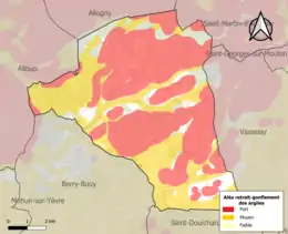 La commune est vulnérable au risque de mouvements de terrains constitué principalement du retrait-gonflement des sols argileux[15]. Cet aléa est susceptible d'engendrer des dommages importants aux bâtiments en cas d’alternance de périodes de sécheresse et de pluie. 88,7 % de la superficie communale est en aléa moyen ou fort (90 % au niveau départemental et 48,5 % au niveau national). Sur les 735 bâtiments dénombrés sur la commune en 2019, 709 sont en aléa moyen ou fort, soit 96 %, à comparer aux 83 % au niveau départemental et 54 % au niveau national. Une cartographie de l'exposition du territoire national au retrait gonflement des sols argileux est disponible sur le site du BRGM[16],[Carte 2].
