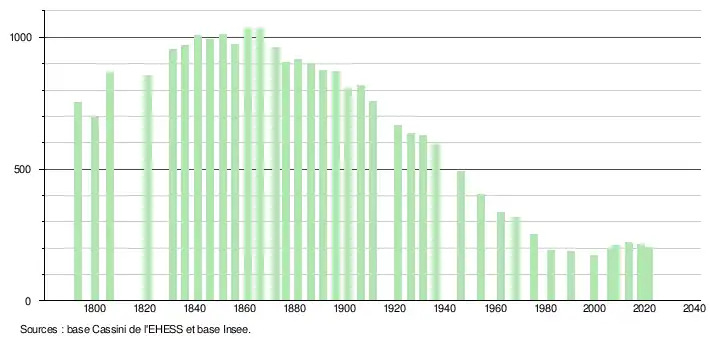 L'évolution du nombre d'habitants est connue à travers les recensements de la population effectués dans la commune depuis 1793. Pour les communes de moins de 10 000 habitants, une enquête de recensement portant sur toute la population est réalisée tous les cinq ans, les populations légales des années intermédiaires étant quant à elles estimées par interpolation ou extrapolation[16]. Pour la commune, le premier recensement exhaustif entrant dans le cadre du nouveau dispositif a été réalisé en 2008[17].