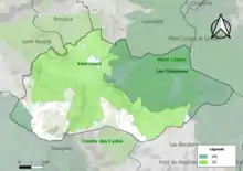 L'occupation des sols de la commune, telle qu'elle ressort de la base de données européenne d’occupation biophysique des sols Corine Land Cover (CLC), est marquée par l'importance des forêts et milieux semi-naturels (69,7 % en 2018), néanmoins en diminution par rapport à 1990 (74,7 %). La répartition détaillée en 2018 est la suivante : forêts (44,7 %), milieux à végétation arbustive et/ou herbacée (25 %), prairies (22,8 %), terres arables (3,5 %), zones agricoles hétérogènes (3,1 %), zones urbanisées (0,9 %)[33]. L'évolution de l’occupation des sols de la commune et de ses infrastructures peut être observée sur les différentes représentations cartographiques du territoire : la carte de Cassini (XVIIIe siècle), la carte d'état-major (1820-1866) et les cartes ou photos aériennes de l'IGN pour la période actuelle (1950 à aujourd'hui)[Carte 1].