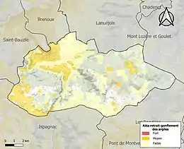 Le retrait-gonflement des sols argileux est susceptible d'engendrer des dommages importants aux bâtiments en cas d’alternance de périodes de sécheresse et de pluie. 17,3 % de la superficie communale est en aléa moyen ou fort (15,8 % au niveau départemental et 48,5 % au niveau national). Sur les 375 bâtiments dénombrés sur la commune en 2019, 50 sont en aléa moyen ou fort, soit 13 %, à comparer aux 14 % au niveau départemental et 54 % au niveau national. Une cartographie de l'exposition du territoire national au retrait gonflement des sols argileux est disponible sur le site du BRGM[41],[Carte 2].