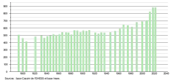 L'évolution du nombre d'habitants est connue à travers les recensements de la population effectués dans la commune depuis 1793. Pour les communes de moins de 10 000 habitants, une enquête de recensement portant sur toute la population est réalisée tous les cinq ans, les populations légales des années intermédiaires étant quant à elles estimées par interpolation ou extrapolation[20]. Pour la commune, le premier recensement exhaustif entrant dans le cadre du nouveau dispositif a été réalisé en 2007[21].