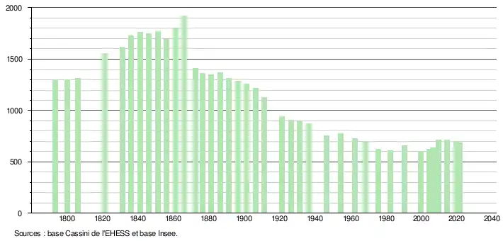 L'évolution du nombre d'habitants est connue à travers les recensements de la population effectués dans la commune depuis 1793. Pour les communes de moins de 10 000 habitants, une enquête de recensement portant sur toute la population est réalisée tous les cinq ans, les populations légales des années intermédiaires étant quant à elles estimées par interpolation ou extrapolation[19]. Pour la commune, le premier recensement exhaustif entrant dans le cadre du nouveau dispositif a été réalisé en 2004[20].