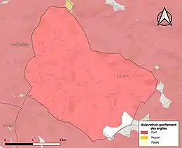 La commune est vulnérable au risque de mouvements de terrains constitué principalement du retrait-gonflement des sols argileux[22]. Cet aléa est susceptible d'engendrer des dommages importants aux bâtiments en cas d’alternance de périodes de sécheresse et de pluie. 97,4 % de la superficie communale est en aléa moyen ou fort (76,3 % au niveau départemental et 48,5 % au niveau national). Sur les 92 bâtiments dénombrés sur la commune en 2019, 92 sont en aléa moyen ou fort, soit 100 %, à comparer aux 90 % au niveau départemental et 54 % au niveau national. Une cartographie de l'exposition du territoire national au retrait gonflement des sols argileux est disponible sur le site du BRGM[23],[Carte 3].