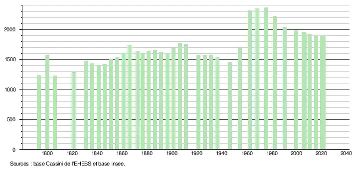 L'évolution du nombre d'habitants est connue à travers les recensements de la population effectués dans la commune depuis 1793. Pour les communes de moins de 10 000 habitants, une enquête de recensement portant sur toute la population est réalisée tous les cinq ans, les populations légales des années intermédiaires étant quant à elles estimées par interpolation ou extrapolation[25]. Pour la commune, le premier recensement exhaustif entrant dans le cadre du nouveau dispositif a été réalisé en 2005[26].