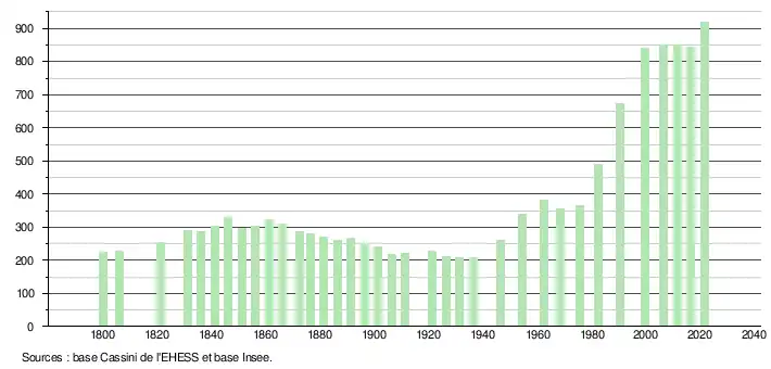 L'évolution du nombre d'habitants est connue à travers les recensements de la population effectués dans la commune depuis 1800. Pour les communes de moins de 10 000 habitants, une enquête de recensement portant sur toute la population est réalisée tous les cinq ans, les populations légales des années intermédiaires étant quant à elles estimées par interpolation ou extrapolation[20]. Pour la commune, le premier recensement exhaustif entrant dans le cadre du nouveau dispositif a été réalisé en 2006[21].