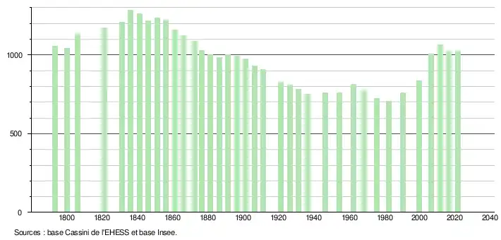 L'évolution du nombre d'habitants est connue à travers les recensements de la population effectués dans la commune depuis 1793. Pour les communes de moins de 10 000 habitants, une enquête de recensement portant sur toute la population est réalisée tous les cinq ans, les populations légales des années intermédiaires étant quant à elles estimées par interpolation ou extrapolation[25]. Pour la commune, le premier recensement exhaustif entrant dans le cadre du nouveau dispositif a été réalisé en 2006[26].