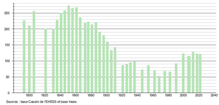 L'évolution du nombre d'habitants est connue à travers les recensements de la population effectués dans la commune depuis 1793. Pour les communes de moins de 10 000 habitants, une enquête de recensement portant sur toute la population est réalisée tous les cinq ans, les populations légales des années intermédiaires étant quant à elles estimées par interpolation ou extrapolation[16]. Pour la commune, le premier recensement exhaustif entrant dans le cadre du nouveau dispositif a été réalisé en 2007[17].