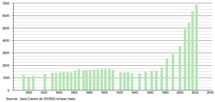 L'évolution du nombre d'habitants est connue à travers les recensements de la population effectués dans la commune depuis 1793. Pour les communes de moins de 10 000 habitants, une enquête de recensement portant sur toute la population est réalisée tous les cinq ans, les populations légales des années intermédiaires étant quant à elles estimées par interpolation ou extrapolation[34]. Pour la commune, le premier recensement exhaustif entrant dans le cadre du nouveau dispositif a été réalisé en 2006[35].