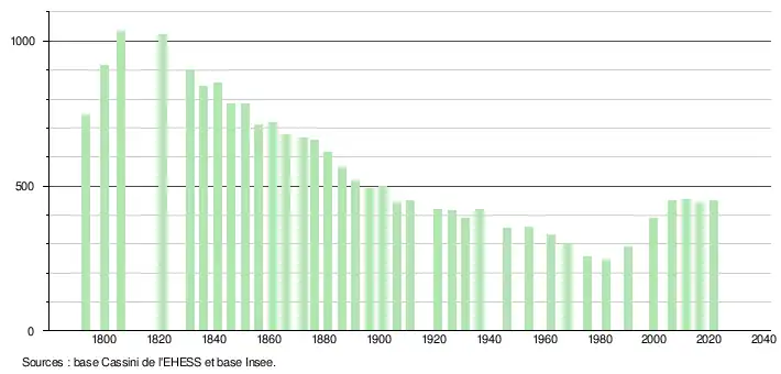 L'évolution du nombre d'habitants est connue à travers les recensements de la population effectués dans la commune depuis 1793. Pour les communes de moins de 10 000 habitants, une enquête de recensement portant sur toute la population est réalisée tous les cinq ans, les populations légales des années intermédiaires étant quant à elles estimées par interpolation ou extrapolation[23]. Pour la commune, le premier recensement exhaustif entrant dans le cadre du nouveau dispositif a été réalisé en 2006[24].