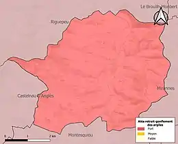 Le retrait-gonflement des sols argileux est susceptible d'engendrer des dommages importants aux bâtiments en cas d’alternance de périodes de sécheresse et de pluie. La totalité de la commune est en aléa moyen ou fort (94,5 % au niveau départemental et 48,5 % au niveau national). Sur les 96 bâtiments dénombrés sur la commune en 2019, 96 sont en aléa moyen ou fort, soit 100 %, à comparer aux 93 % au niveau départemental et 54 % au niveau national. Une cartographie de l'exposition du territoire national au retrait gonflement des sols argileux est disponible sur le site du BRGM[25],[Carte 3].