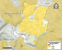 Les mouvements de terrains susceptibles de se produire sur la commune sont des tassements différentiels[39]. Le retrait-gonflement des sols argileux est susceptible d'engendrer des dommages importants aux bâtiments en cas d’alternance de périodes de sécheresse et de pluie[40]. 68,2 % de la superficie communale est en aléa moyen ou fort (58,6 % au niveau départemental et 48,5 % au niveau national métropolitain)[Carte 4]. Depuis le , en application de la loi ÉLAN, différentes contraintes s'imposent aux vendeurs, maîtres d'ouvrages ou constructeurs de biens situés dans une zone classée en aléa moyen ou fort[Note 5],[41].