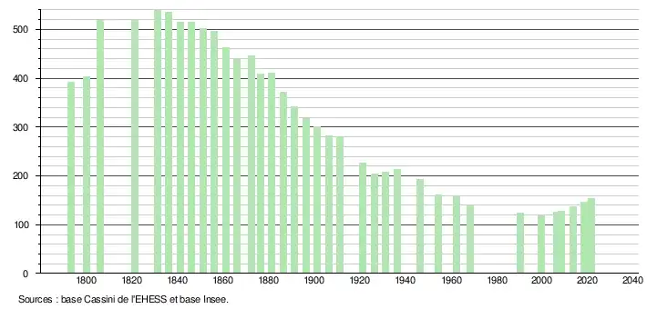 L'évolution du nombre d'habitants est connue à travers les recensements de la population effectués dans la commune depuis 1793. Pour les communes de moins de 10 000 habitants, une enquête de recensement portant sur toute la population est réalisée tous les cinq ans, les populations légales des années intermédiaires étant quant à elles estimées par interpolation ou extrapolation[50]. Pour la commune, le premier recensement exhaustif entrant dans le cadre du nouveau dispositif a été réalisé en 2008[51].