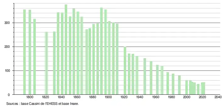 L'évolution du nombre d'habitants est connue à travers les recensements de la population effectués dans la commune depuis 1793. Pour les communes de moins de 10 000 habitants, une enquête de recensement portant sur toute la population est réalisée tous les cinq ans, les populations légales des années intermédiaires étant quant à elles estimées par interpolation ou extrapolation[19]. Pour la commune, le premier recensement exhaustif entrant dans le cadre du nouveau dispositif a été réalisé en 2004[20].