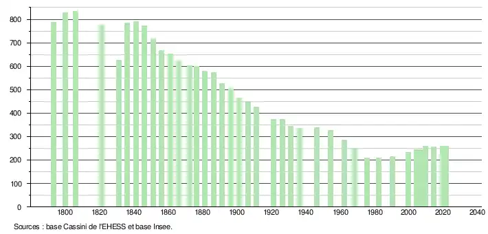 L'évolution du nombre d'habitants est connue à travers les recensements de la population effectués dans la commune depuis 1793. Pour les communes de moins de 10 000 habitants, une enquête de recensement portant sur toute la population est réalisée tous les cinq ans, les populations légales des années intermédiaires étant quant à elles estimées par interpolation ou extrapolation[26]. Pour la commune, le premier recensement exhaustif entrant dans le cadre du nouveau dispositif a été réalisé en 2004[27].