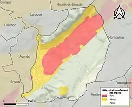 La commune est vulnérable au risque de mouvements de terrains constitué principalement du retrait-gonflement des sols argileux[37]. Cet aléa est susceptible d'engendrer des dommages importants aux bâtiments en cas d’alternance de périodes de sécheresse et de pluie. 46,1 % de la superficie communale est en aléa moyen ou fort (59,3 % au niveau départemental et 48,5 % au niveau national). Sur les 840 bâtiments dénombrés sur la commune en 2019, 839 sont en aléa moyen ou fort, soit 100 %, à comparer aux 85 % au niveau départemental et 54 % au niveau national. Une cartographie de l'exposition du territoire national au retrait gonflement des sols argileux est disponible sur le site du BRGM[38],[Carte 2].
