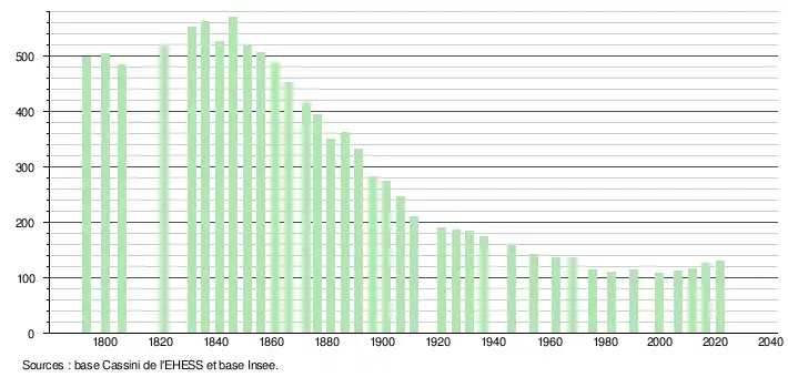 | L'évolution du nombre d'habitants est connue à travers les recensements de la population effectués dans la commune depuis 1793. Pour les communes de moins de 10 000 habitants, une enquête de recensement portant sur toute la population est réalisée tous les cinq ans, les populations légales des années intermédiaires étant quant à elles estimées par interpolation ou extrapolation[31]. Pour la commune, le premier recensement exhaustif entrant dans le cadre du nouveau dispositif a été réalisé en 2006[32]. En 2021, la commune comptait 130 habitants[Note 8], en augmentation de 4 % par rapport à 2015 (Tarn : +1,82 %, France hors Mayotte : +1,84 %). |