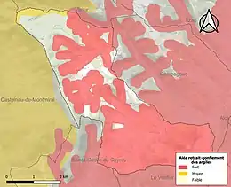 La commune est vulnérable au risque de mouvements de terrains constitué principalement du retrait-gonflement des sols argileux[25]. Cet aléa est susceptible d'engendrer des dommages importants aux bâtiments en cas d’alternance de périodes de sécheresse et de pluie. 77,8 % de la superficie communale est en aléa moyen ou fort (76,3 % au niveau départemental et 48,5 % au niveau national). Sur les 94 bâtiments dénombrés sur la commune en 2019, 86 sont en aléa moyen ou fort, soit 91 %, à comparer aux 90 % au niveau départemental et 54 % au niveau national. Une cartographie de l'exposition du territoire national au retrait gonflement des sols argileux est disponible sur le site du BRGM[26],[Carte 3].