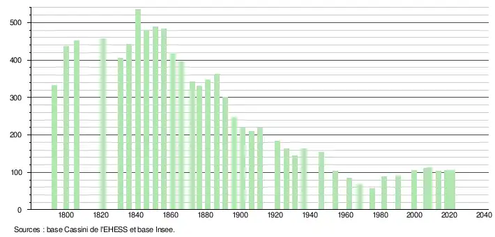 L'évolution du nombre d'habitants est connue à travers les recensements de la population effectués dans la commune depuis 1793. Pour les communes de moins de 10 000 habitants, une enquête de recensement portant sur toute la population est réalisée tous les cinq ans, les populations légales des années intermédiaires étant quant à elles estimées par interpolation ou extrapolation[20]. Pour la commune, le premier recensement exhaustif entrant dans le cadre du nouveau dispositif a été réalisé en 2008[21].