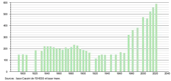 L'évolution du nombre d'habitants est connue à travers les recensements de la population effectués dans la commune depuis 1793. Pour les communes de moins de 10 000 habitants, une enquête de recensement portant sur toute la population est réalisée tous les cinq ans, les populations légales des années intermédiaires étant quant à elles estimées par interpolation ou extrapolation[16]. Pour la commune, le premier recensement exhaustif entrant dans le cadre du nouveau dispositif a été réalisé en 2006[17].
