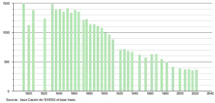 L'évolution du nombre d'habitants est connue à travers les recensements de la population effectués dans la commune depuis 1793. Pour les communes de moins de 10 000 habitants, une enquête de recensement portant sur toute la population est réalisée tous les cinq ans, les populations légales des années intermédiaires étant quant à elles estimées par interpolation ou extrapolation[14]. Pour la commune, le premier recensement exhaustif entrant dans le cadre du nouveau dispositif a été réalisé en 2006[15].