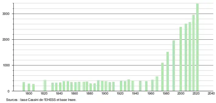 L'évolution du nombre d'habitants est connue à travers les recensements de la population effectués dans la commune depuis 1793. Pour les communes de moins de 10 000 habitants, une enquête de recensement portant sur toute la population est réalisée tous les cinq ans, les populations légales des années intermédiaires étant quant à elles estimées par interpolation ou extrapolation[24]. Pour la commune, le premier recensement exhaustif entrant dans le cadre du nouveau dispositif a été réalisé en 2006[25].