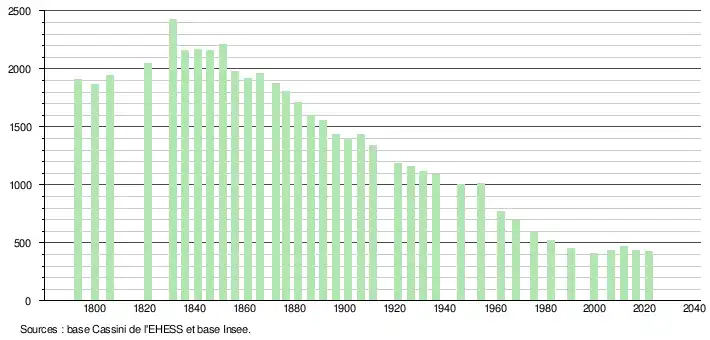 L'évolution du nombre d'habitants est connue à travers les recensements de la population effectués dans la commune depuis 1793. Pour les communes de moins de 10 000 habitants, une enquête de recensement portant sur toute la population est réalisée tous les cinq ans, les populations légales des années intermédiaires étant quant à elles estimées par interpolation ou extrapolation[23]. Pour la commune, le premier recensement exhaustif entrant dans le cadre du nouveau dispositif a été réalisé en 2006[24].