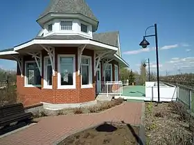 La première gare, érigée en 1848 par la St. Lawrence & Atlantic Railroad et inaugurée en 1849, était située à l'angle de la « montée du dépôt » (devenue rue des Cèdres) et de l'actuelle route 116.